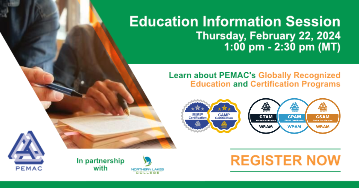 You're invited to join us for our complimentary information session – delivered LIVE Online (in partnership with Northern Lakes College) to learn more about PEMAC's Education and Certification. Participate from the comfort of your office or home at your computer, and learn more about the Maintenance Management Professional (MMP) program, Asset Management Professional (AMP) programs, as well as the Becoming a Certified Asset Management Assessor Course. You will also learn more about the Global Certification Scheme and the many PEMAC Maintenance and AM certifications that align to the global scheme.